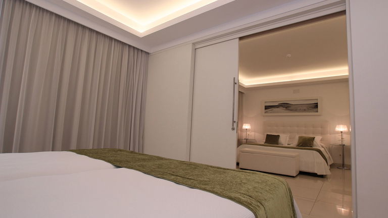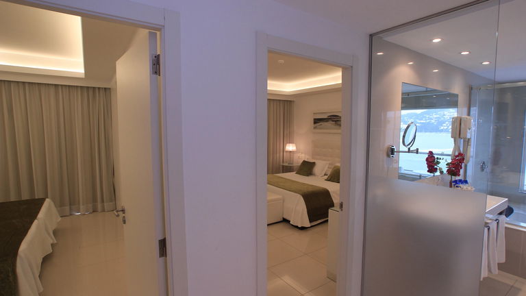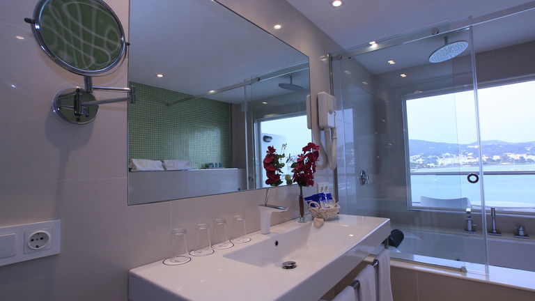 Family Suite Zimmer mit Doppelbett 2x2 M und zwei Einzelbetten mit Flur, 2 TV, Klimaanlage, Badezimmer mit Jacuzzi und Panoramablick vom Badezimmer auf die Bucht von Talamanca. 2 Terrassen mit Meerblick. Speziell für Familienfeiern.