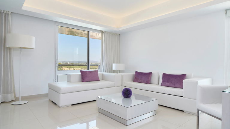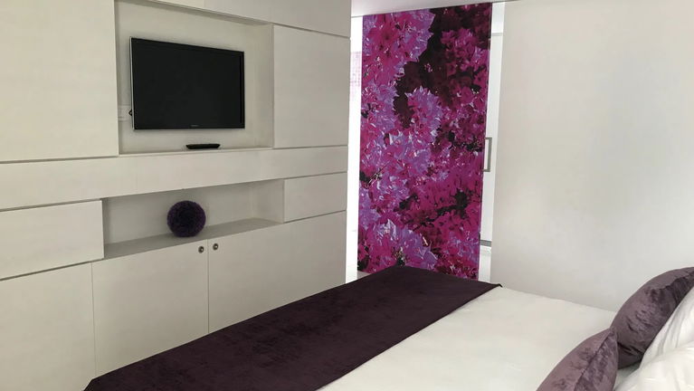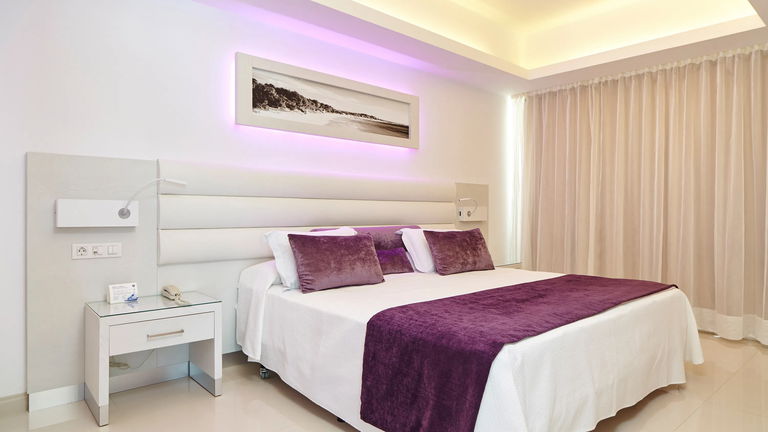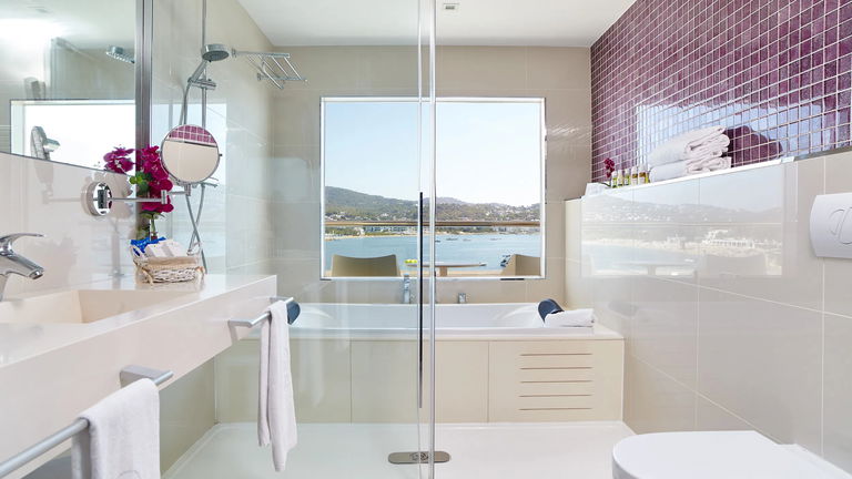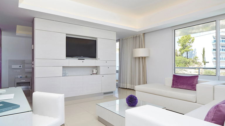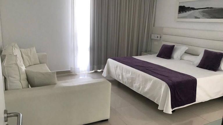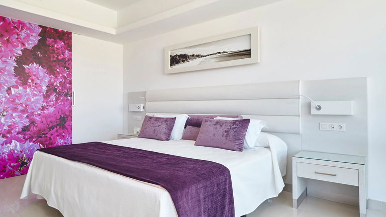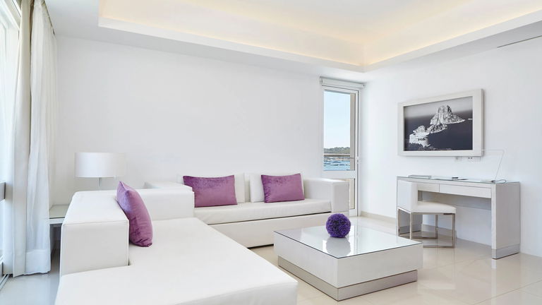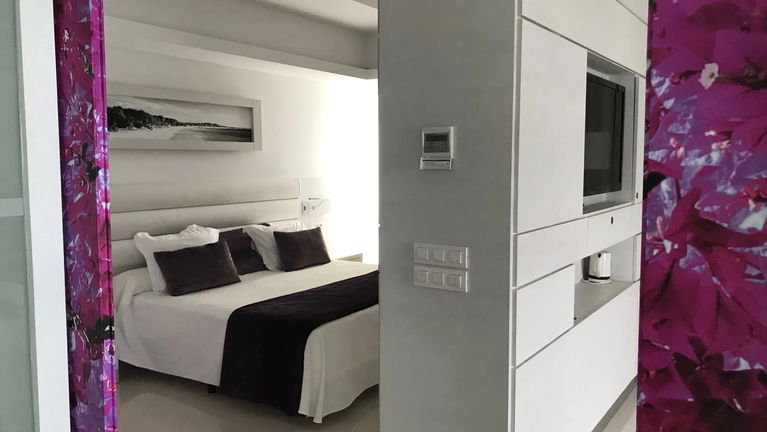 Suite Zimmer mit Doppelbett 2x2 Meter für 2 Personen mit Flur, Wohnzimmer mit Sofa, 2 TV, Klimaanlage, Bad mit Whirlpool und Panorama vom Bad bis zur Bucht von Talamanca. 2 Terrassen mit Meerblick. Speziell für Paare.