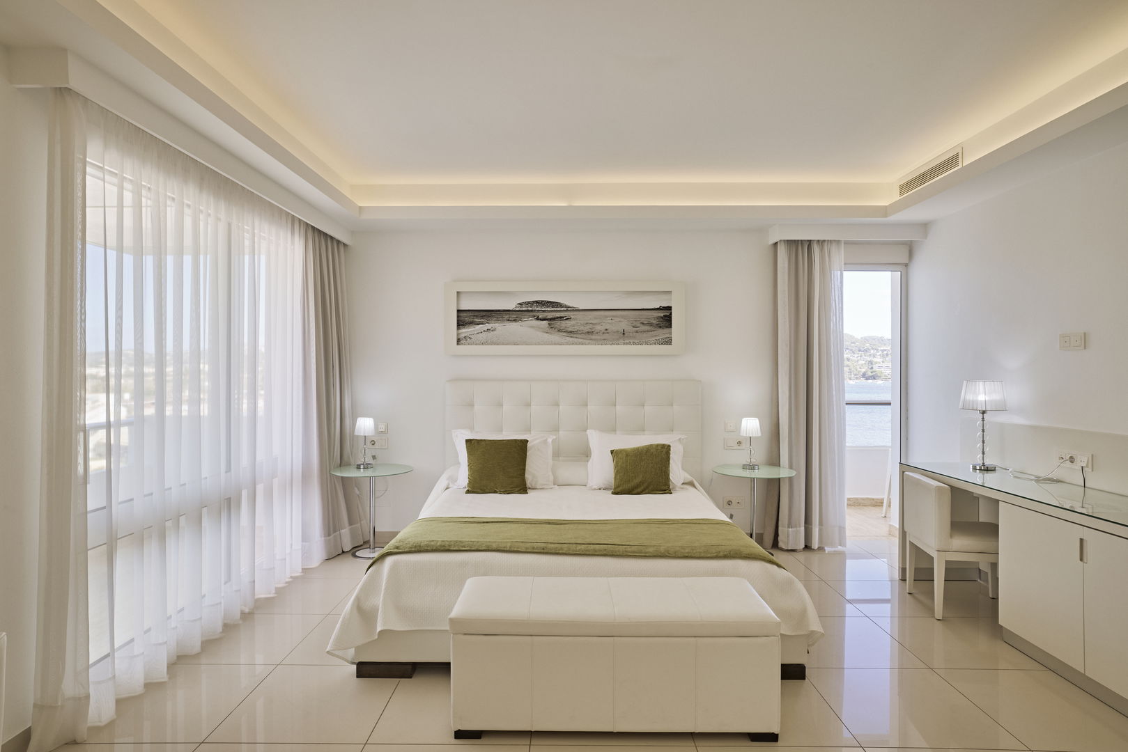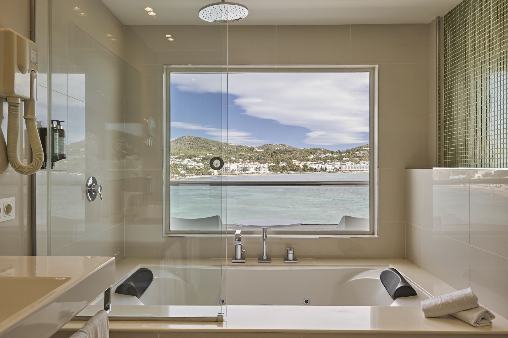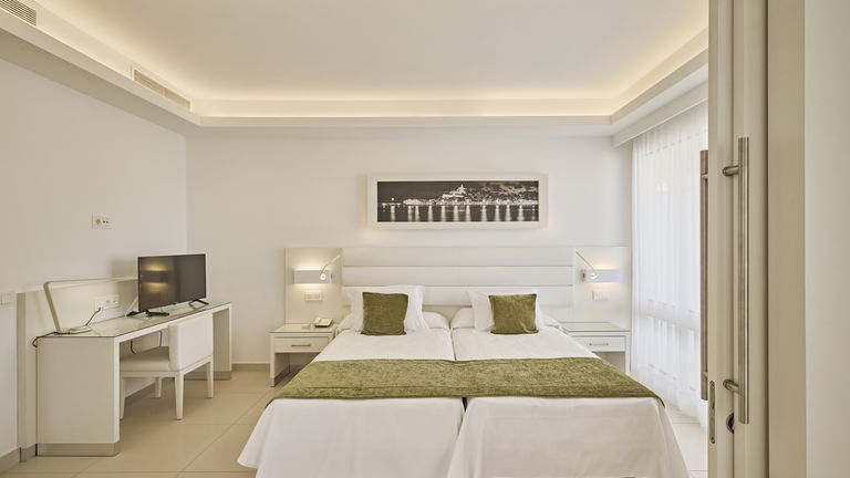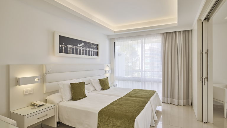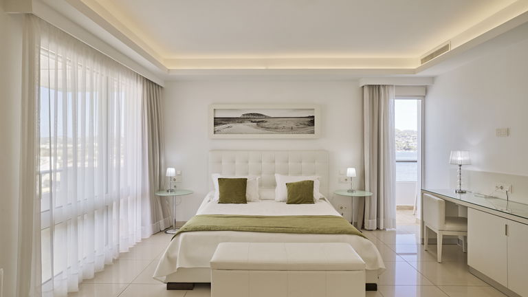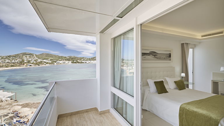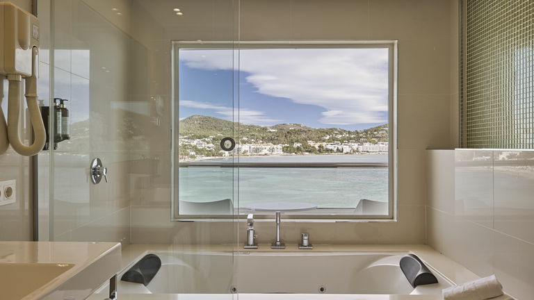 Habitación Suite familiar con cama de matrimonio 2x2 M y dos camas simples con recibidor, 2 TV, Aire acondicionado, baño con jacuzzi y con panorámica desde el baño a la bahia de Talamanca. 2 terrazas con vistas al mar. Especial para celebraciones en familia.