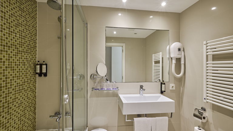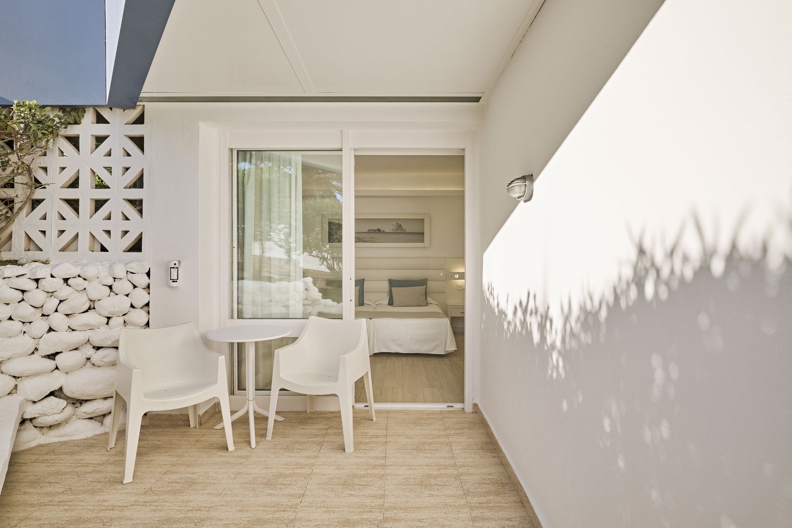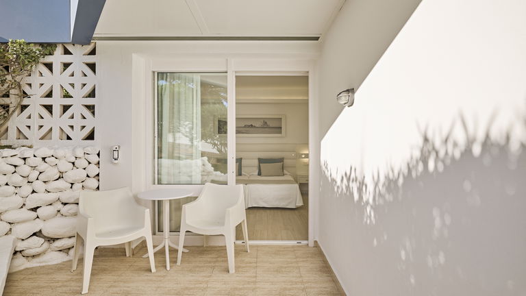 1 baño en la habitación y una pequeña terraza con vistas al jardin.